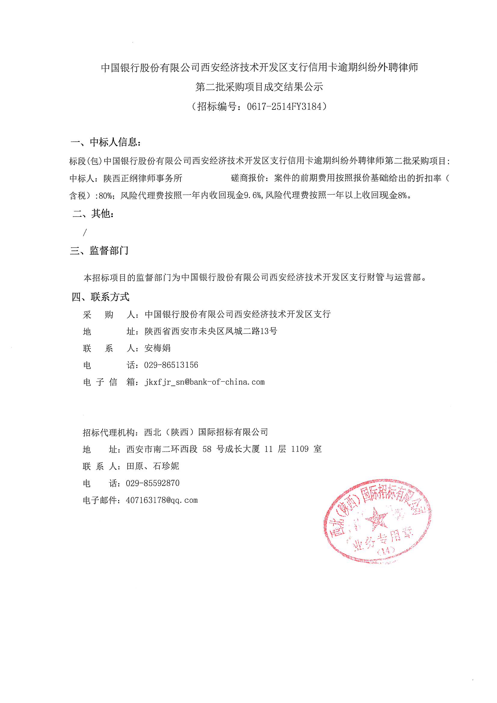 中國(guó)銀行股份有限公司西安經(jīng)濟(jì)技術(shù)開發(fā)區(qū)支行信用卡逾期糾紛外聘律師第二批采購(gòu)項(xiàng)目成交結(jié)果公示